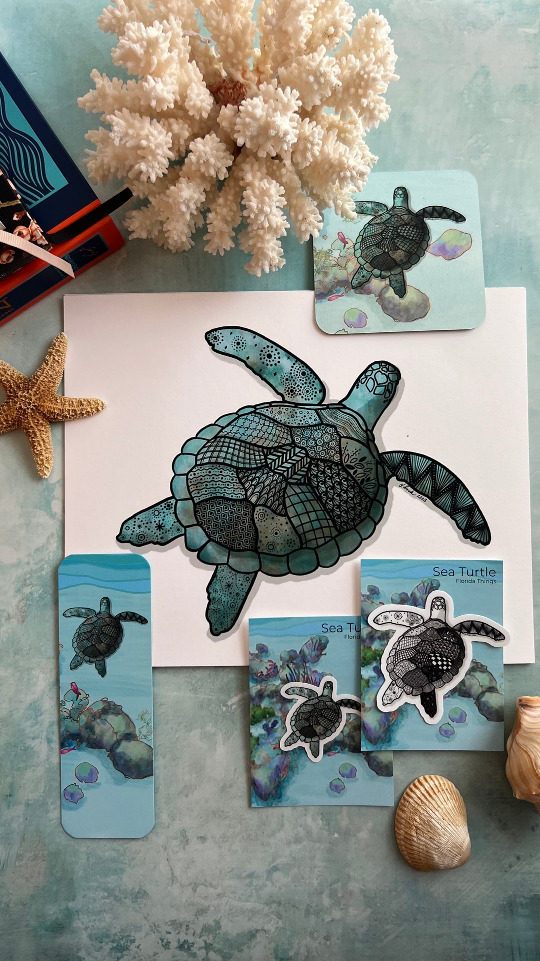 Sea Turtle Art Bundle | Print 8 x 10 | Bookmark | 3 stickers | Colorful Ocean Wall Art | Marine Life Illustration, Coastal Beach Decor